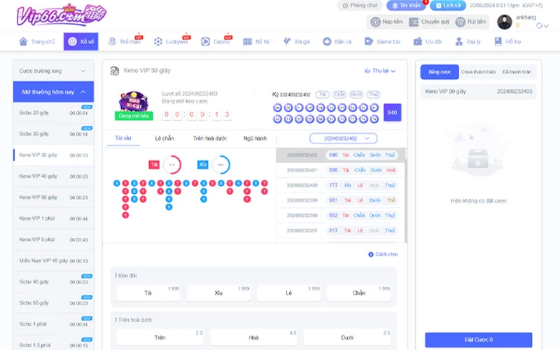 Sau khi nạp tiền thành công, người chơi vào mục “Xổ số” và chọn loại hình lô đề mà mình muốn tham gia. Vip66 cung cấp nhiều loại hình xổ số khác nhau, từ xổ số miền Bắc, miền Nam, miền Trung đến Vietlott, Loto,… Người chơi chỉ cần chọn loại hình yêu thích, chọn con số may mắn và đặt cược theo mức tiền mong muốn.